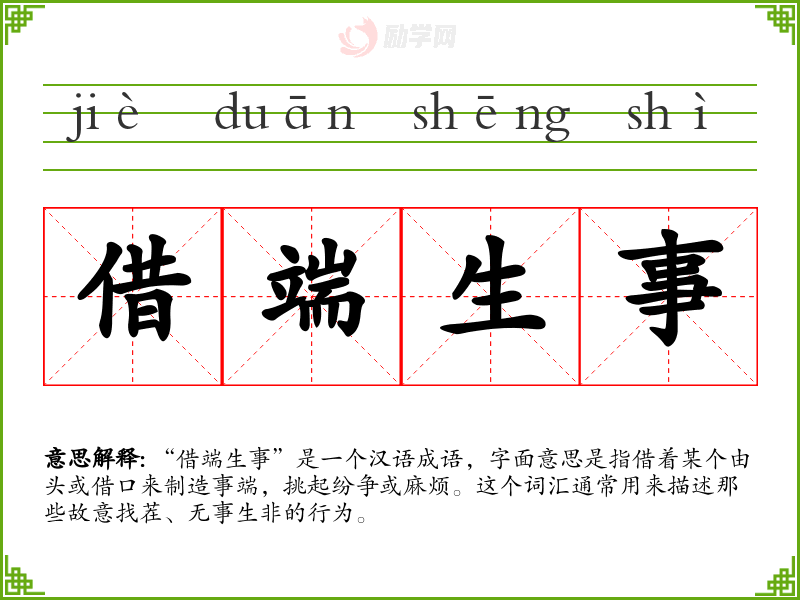 “借端生事”是一个汉语成语,字面意思是指借着某个由头或借口来制造事端,挑起纷争或麻烦。这个词汇通常用来描述那些故意找茬、无事生非的行为。