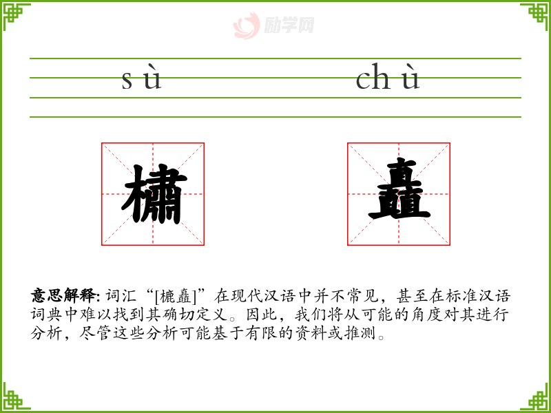词汇“[樚矗]”在现代汉语中并不常见,甚至在标准汉语词典中难以找到其确切定义。因此,我们将从可能的角度对其进行分析,尽管这些分析可能基于有限的资料或推测。