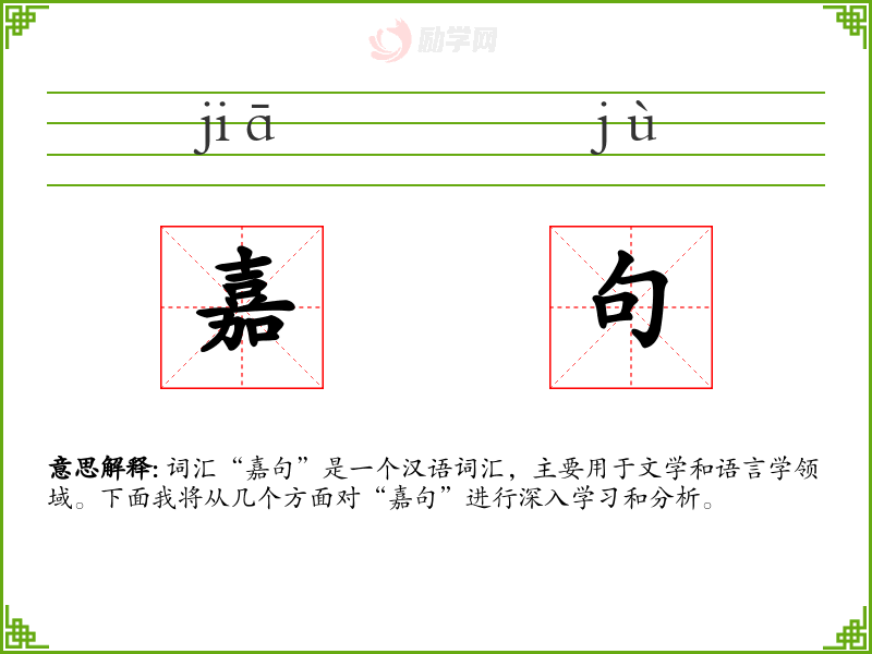 - 专业领域:在语言学或文学研究中,“嘉句”可能被用来分析语言的美学特征或修辞手法。