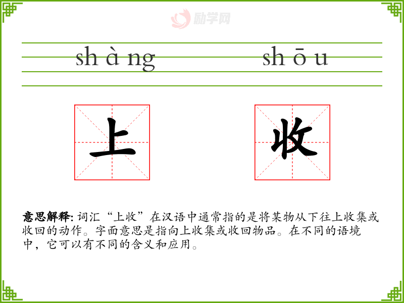 “上收”这个词在汉语中是一个非常实用的词汇,它不仅描述了一个具体的动作,还蕴含了有序和整理的意味。在学*汉语和进行表达时,理解和正确使用这样的词汇对于提高语言的准确性和丰富性非常重要。
