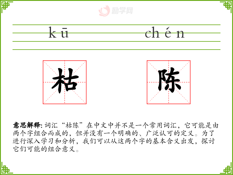 词汇“枯陈”在中文中并不是一个常用词汇,它可能是由两个字组合而成的,但并没有一个明确的、广泛认可的定义。为了进行深入学习和分析,我们可以从这两个字的基本含义出发,探讨它们可能的组合意义。