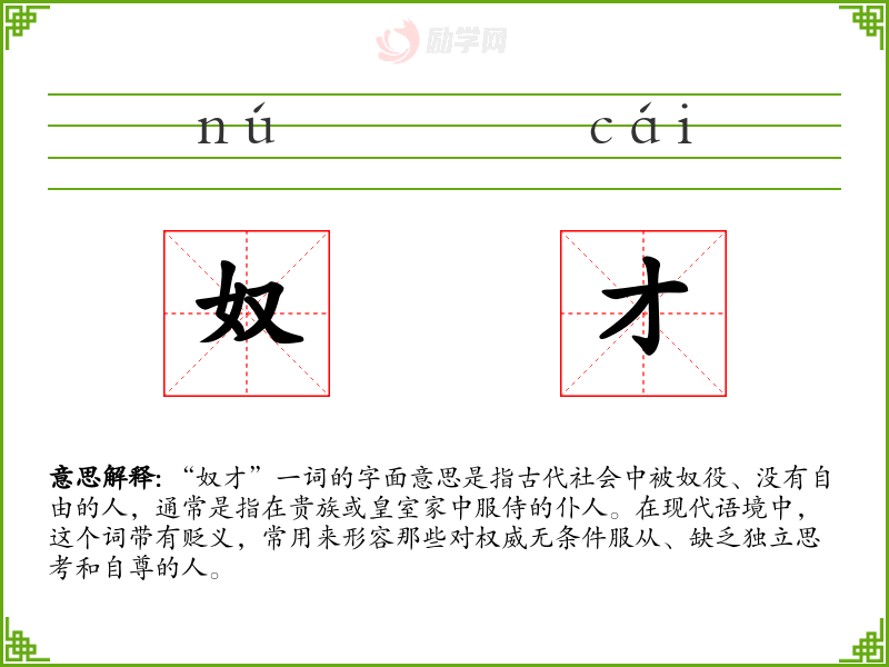 - 反义词:主人、领袖、独立者。这些词与“奴才”形成鲜明对比,强调自主和领导地位。