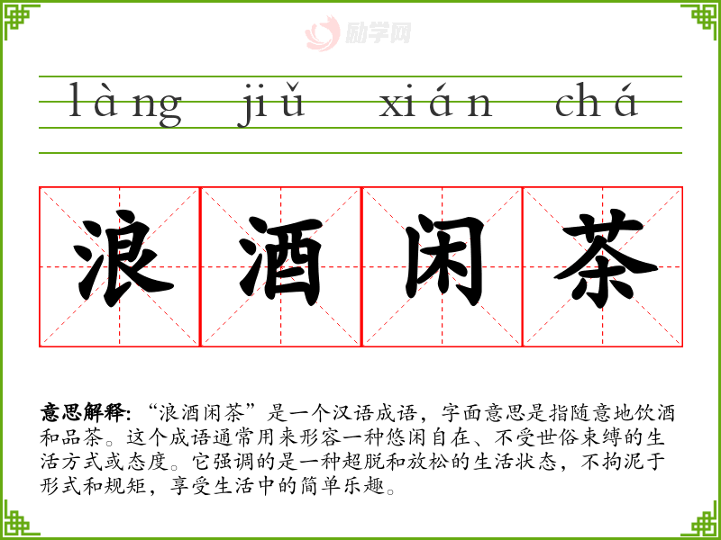 “浪酒闲茶”这个成语不仅描述了一种生活方式,也反映了人们对于简单、自然生活的追求。在我个人的语言学*和表达中,它提醒我要珍惜生活中的简单乐趣,追求内心的平静和满足。