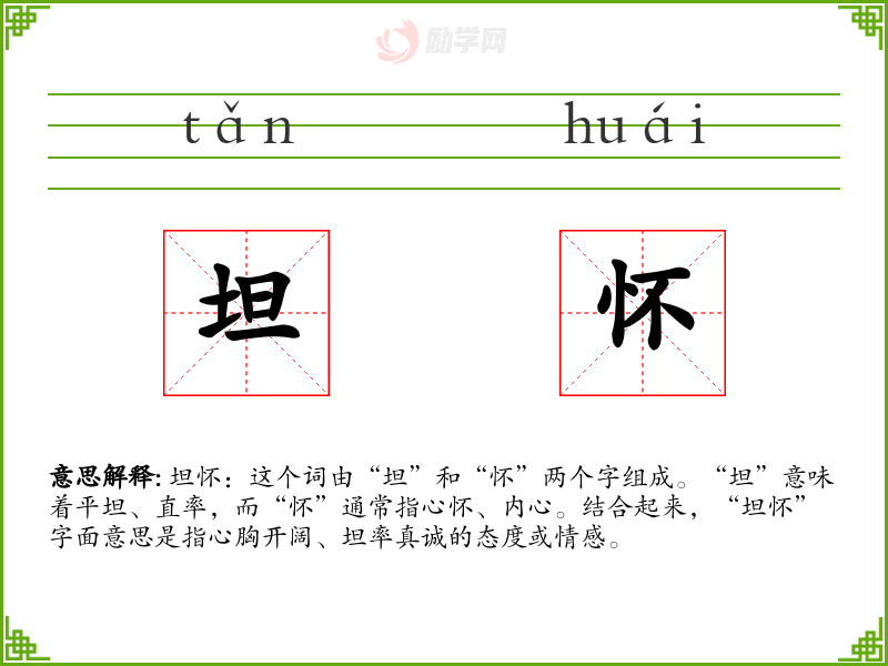 坦怀:这个词由“坦”和“怀”两个字组成。“坦”意味着平坦、直率,而“怀”通常指心怀、内心。结合起来,“坦怀”字面意思是指心胸开阔、坦率真诚的态度或情感。