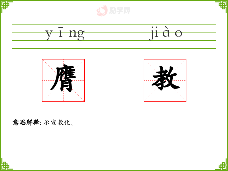 《说文》-上所施下所效也。 《周礼·师氏》。注:“教之者,使识旧事也。”-以教国子弟。 《礼记·学记》-教也者,长善而救其失者也。 《礼记·乐记》-教者,民之寒暑也。 《国语·周语》-教,文之施也。 《春秋繁露》-精华,教政之本也。 《管子·小匡》-君有此教士三万人。 《韩非子·五蠹》-修教三年。 《史记·货殖列传》-宁有政教。 唐·韩愈《师说》-择师而教。 唐·柳宗元《柳河东集》-以教吾子。 宋·王安石《答司马谏议书》-昨日蒙教。