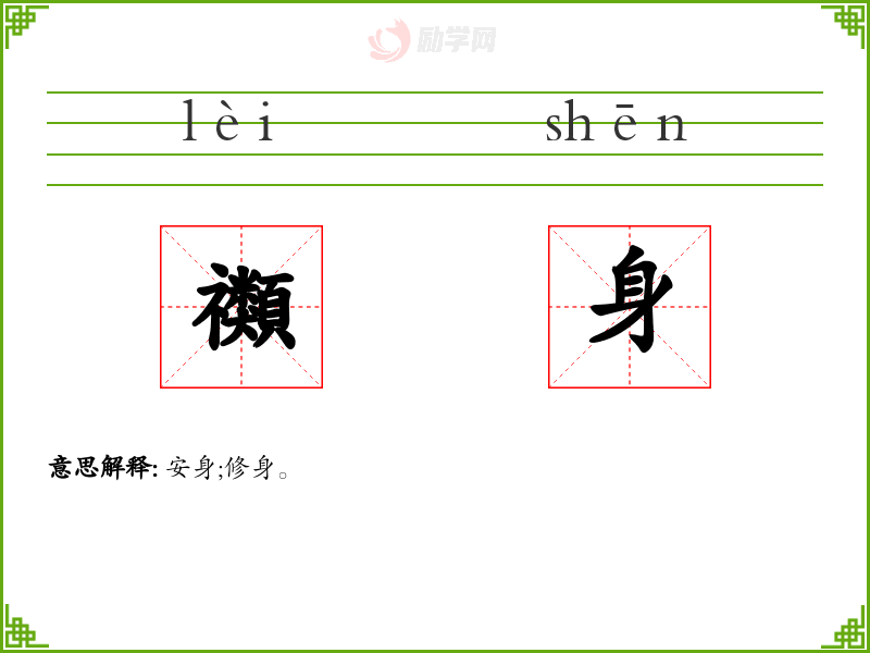 《说文》。按,身的本义是人的躯干。-身,躬也。象人之形。 《论语·乡党》-必有寝礼,长一身有半。 王述之《经义述闻》-人自项以下,踵以上,总谓之身。颈以下,股以上,亦谓之身。 《诗·秦风·黄鸟》-人百其身。 《礼记·哀公问》-身也者,亲之枝也。 《礼记·祭义》-身也者,父母之遗体也。 《孟子·告子下》-饿其体肤,空乏其身。 《楚辞·九歌·国殇》-身首离兮心不惩。 明·于谦《石灰吟》-粉骨碎身浑不怕,要留青白在人间。 《史记·项羽本纪》-项伯亦拔剑起舞,常以身翼蔽沛公,庄不得击。