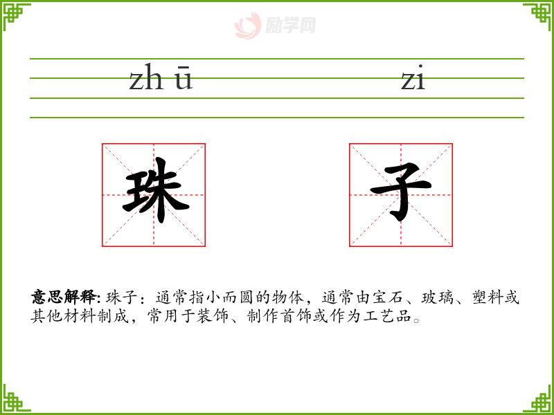 - 词源:珠子一词源自古代汉语,最早指珍珠,后来泛指各种小圆形的装饰物。