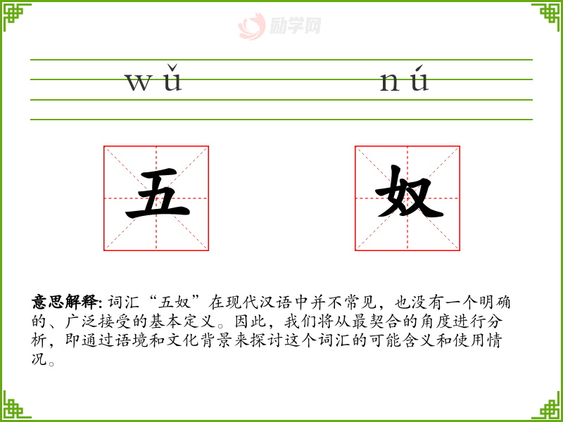 词汇“五奴”在现代汉语中并不常见,也没有一个明确的、广泛接受的基本定义。因此,我们将从最契合的角度进行分析,即通过语境和文化背景来探讨这个词汇的可能含义和使用情况。