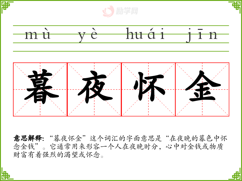 “暮夜怀金”这个词汇的字面意思是“在夜晚的暮色中怀念金钱”。它通常用来形容一个人在夜晚时分,心中对金钱或物质财富有着强烈的渴望或怀念。