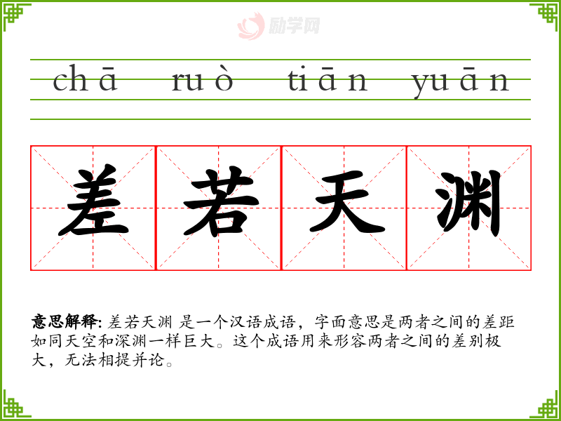 差若天渊 这个成语在描述极端差异时非常有用,它不仅丰富了语言表达,也帮助我们更生动地理解和传达差异的强烈程度。在学*语言和表达时,掌握这样的成语可以增强我们的表达能力和语言的丰富性。