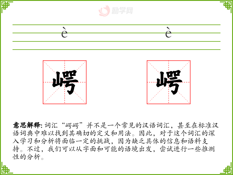 词汇“崿崿”并不是一个常见的汉语词汇,甚至在标准汉语词典中难以找到其确切的定义和用法。因此,对于这个词汇的深入学习和分析将面临一定的挑战,因为缺乏具体的信息和语料支持。不过,我们可以从字面和可能的语境出发,尝试进行一些推测性的分析。