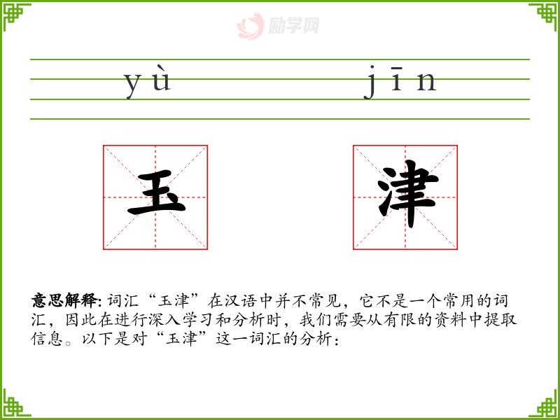 词汇“玉津”在汉语中并不常见,它不是一个常用的词汇,因此在进行深入学*和分析时,我们需要从有限的资料中提取信息。以下是对“玉津”这一词汇的分析: