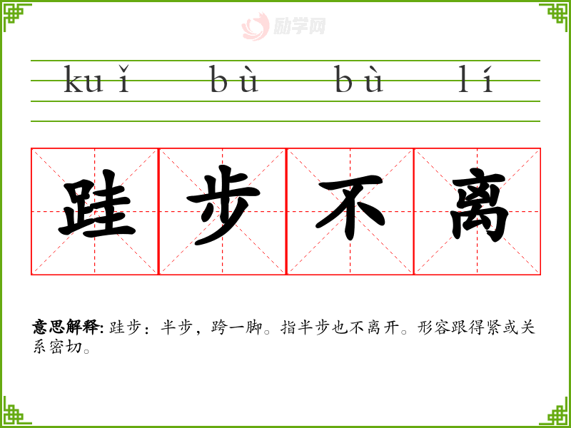 跬步:半步,跨一脚。指半步也不离开。形容跟得紧或关系密切。