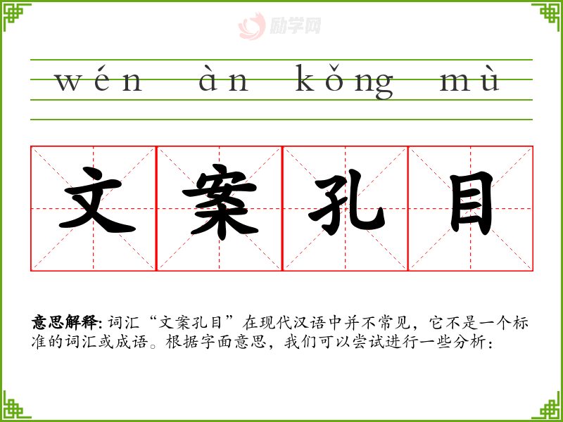 词汇“文案孔目”在现代汉语中并不常见,它不是一个标准的词汇或成语。根据字面意思,我们可以尝试进行一些分析: