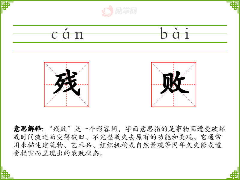 通过对“残败”一词的深入学,我们可以更好地理解其在不同语境中的应用,以及它所承载的情感和文化意义。在语言学和表达中,掌握这样的词汇有助于丰富我们的语言表达能力,使描述更加生动和深刻。