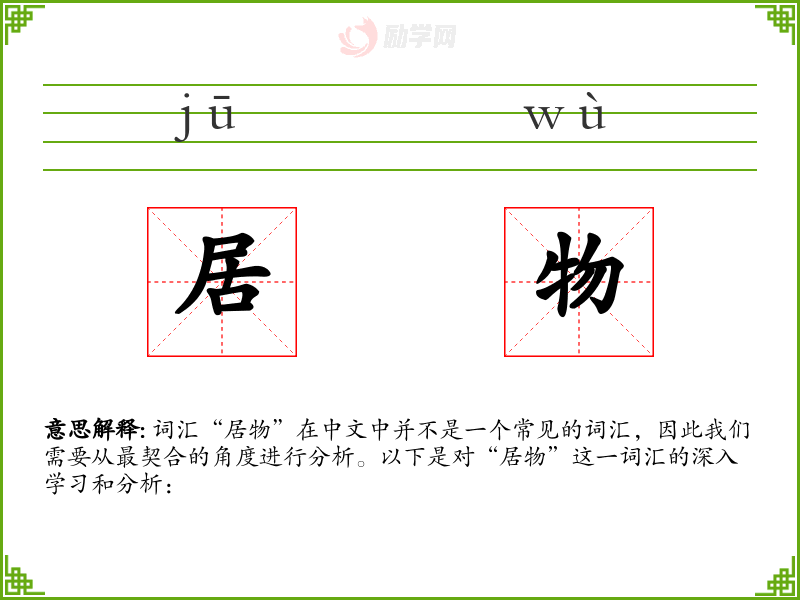 词汇“居物”在中文中并不是一个常见的词汇,因此我们需要从最契合的角度进行分析。以下是对“居物”这一词汇的深入学*和分析: