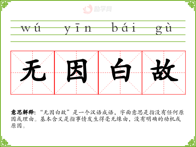 “无因白故”是一个汉语成语,字面意思是指没有任何原因或理由。基本含义是指事情发生得毫无缘由,没有明确的动机或原因。