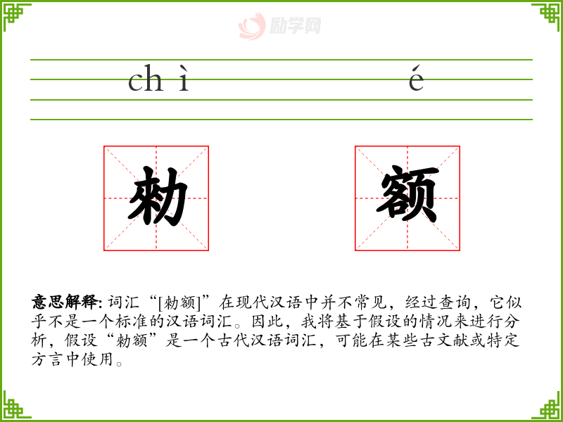 词汇“[勑额]”在现代汉语中并不常见,经过查询,它似乎不是一个标准的汉语词汇。因此,我将基于假设的情况来进行分析,假设“勑额”是一个古代汉语词汇,可能在某些古文献或特定方言中使用。