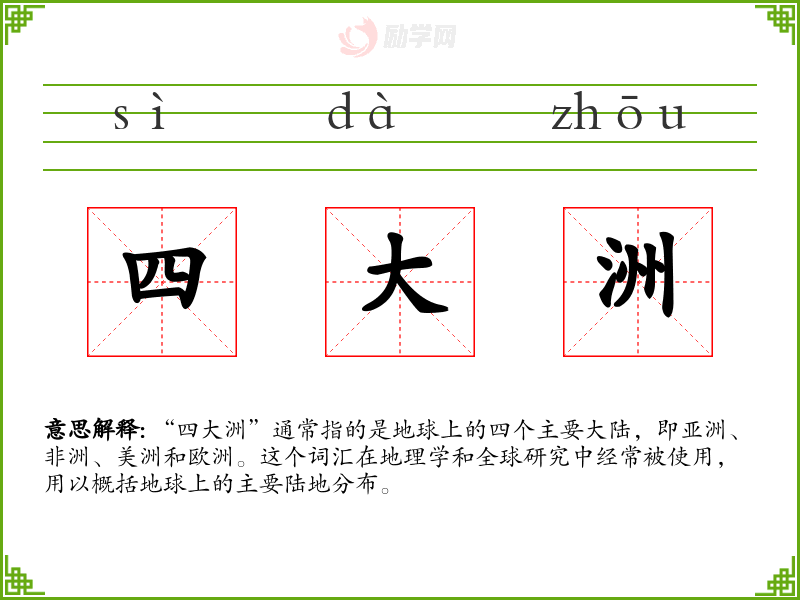 四大洲的意思是:古印度传说,谓须弥山四方咸海中有四大洲,为人类居住的地区。其说为佛教所采用,传来中国后,因佛经译本不一,洲名也各不相同。通称为东胜身洲(亦作东毗提诃洲﹑东拂于逮洲),南赡部洲(亦作南阎浮提洲),西牛货洲(亦作西瞿陀尼洲﹑西瞿耶尼洲),北俱卢洲(亦作北郁单越洲)。