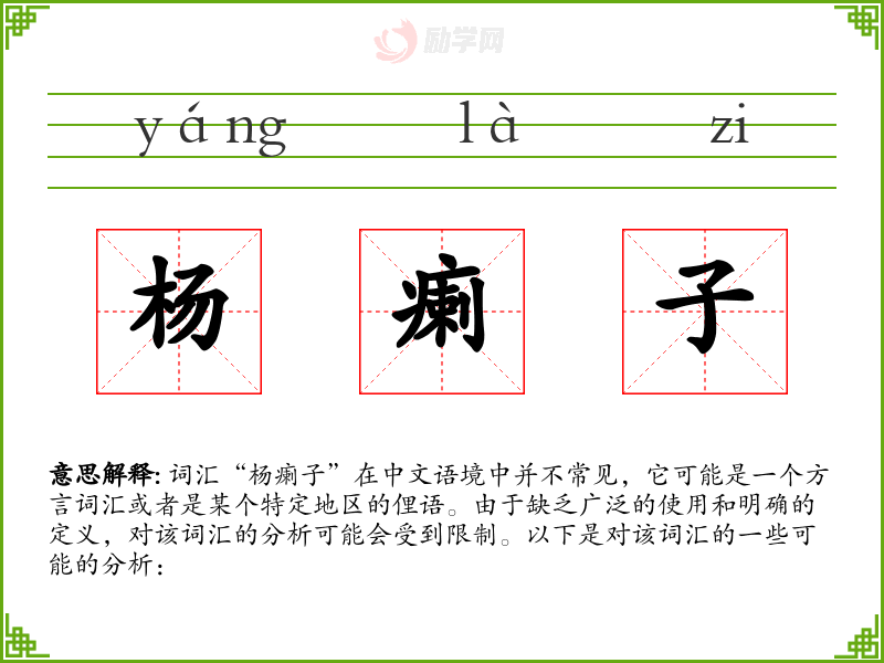 词汇“杨瘌子”在中文语境中并不常见,它可能是一个方言词汇或者是某个特定地区的俚语。由于缺乏广泛的使用和明确的定义,对该词汇的分析可能会受到限制。以下是对该词汇的一些可能的分析:
