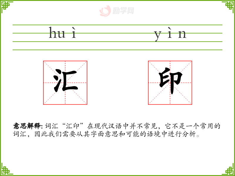 词汇“汇印”在现代汉语中并不常见,它不是一个常用的词汇,因此我们需要从其字面意思和可能的语境中进行分析。