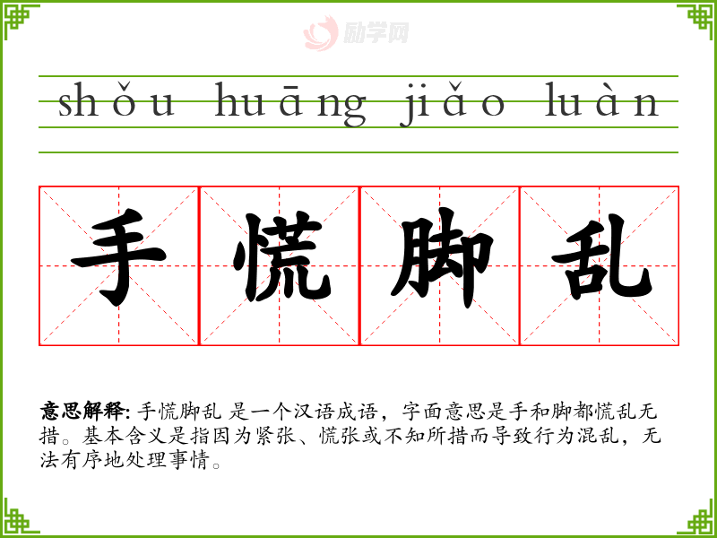 手慌脚乱 是一个汉语成语,字面意思是手和脚都慌乱无措。基本含义是指因为紧张、慌张或不知所措而导致行为混乱,无法有序地处理事情。