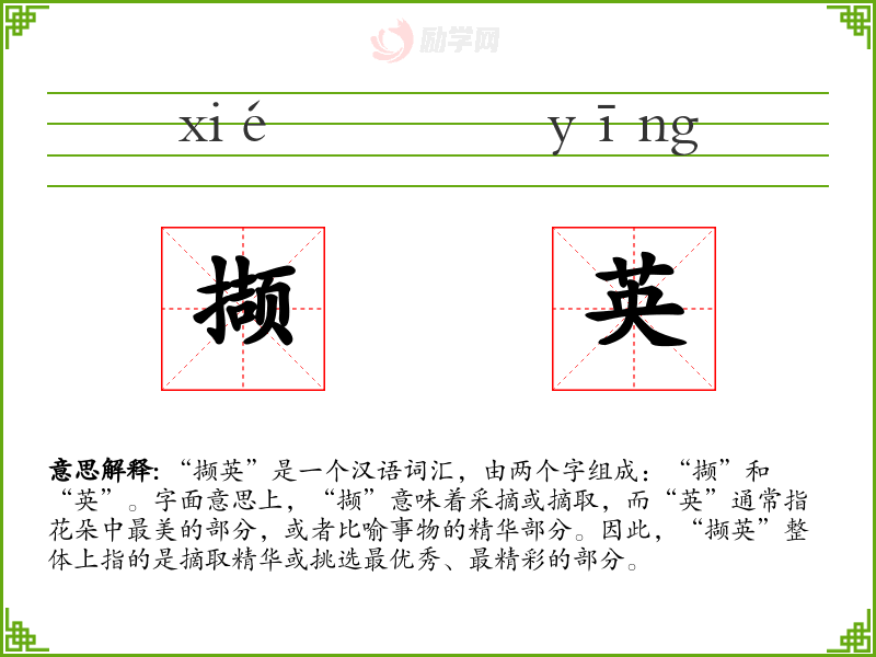 撷英的意思是:吸取精华。