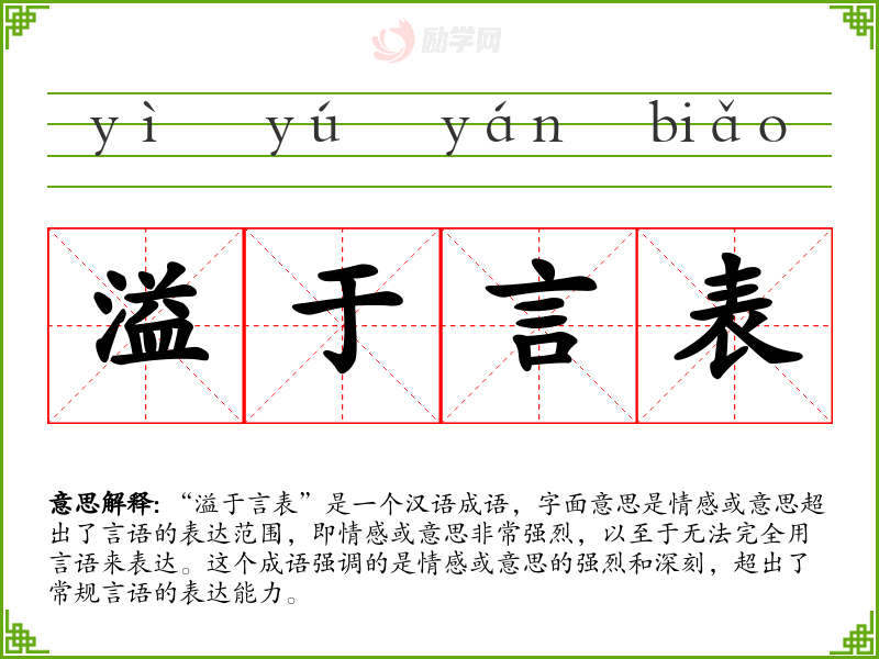 “溢于言表”是一个汉语成语,字面意思是情感或意思超出了言语的表达范围,即情感或意思非常强烈,以至于无法完全用言语来表达。这个成语强调的是情感或意思的强烈和深刻,超出了常规言语的表达能力。