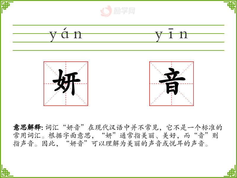 词汇“妍音”在现代汉语中并不常见,它不是一个标准的常用词汇。根据字面意思,“妍”通常指美丽、美好,而“音”则指声音。因此,“妍音”可以理解为美丽的声音或悦耳的声音。
