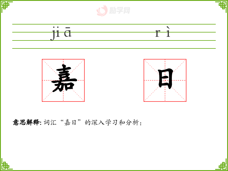 - 文学:在文学作品中,“嘉日”常用来形容节日、庆典或重要的纪念日,如“嘉日良辰”。