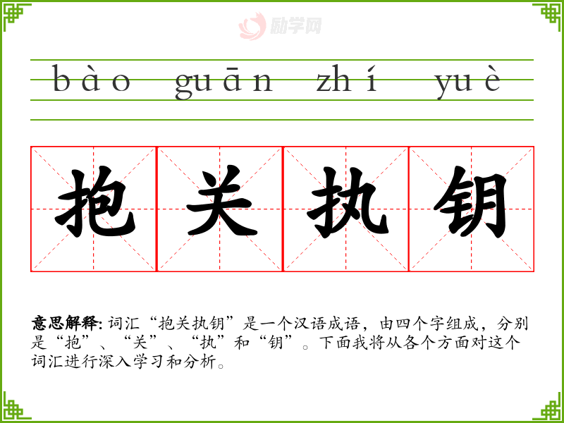 词汇“抱关执钥”是一个汉语成语,由四个字组成,分别是“抱”、“关”、“执”和“钥”。下面我将从各个方面对这个词汇进行深入学*和分析。