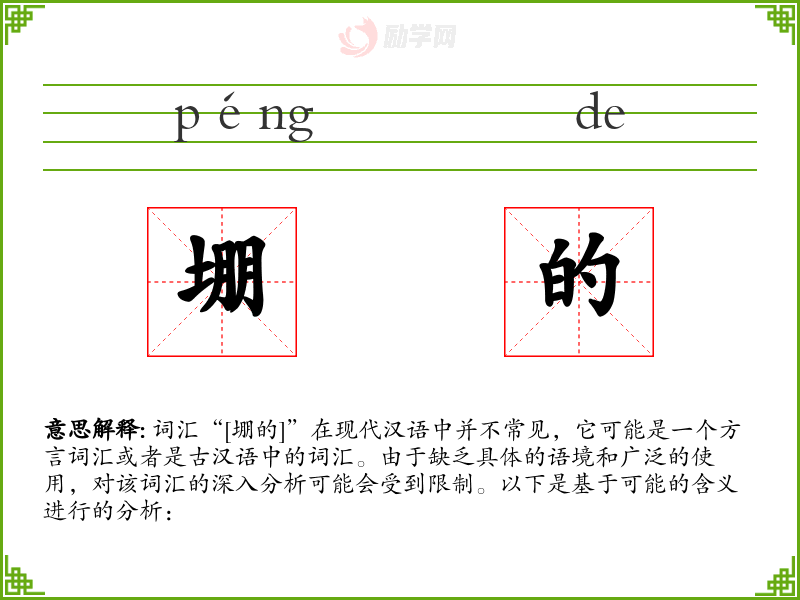 词汇“[堋的]”在现代汉语中并不常见,它可能是一个方言词汇或者是古汉语中的词汇。由于缺乏具体的语境和广泛的使用,对该词汇的深入分析可能会受到限制。以下是基于可能的含义进行的分析: