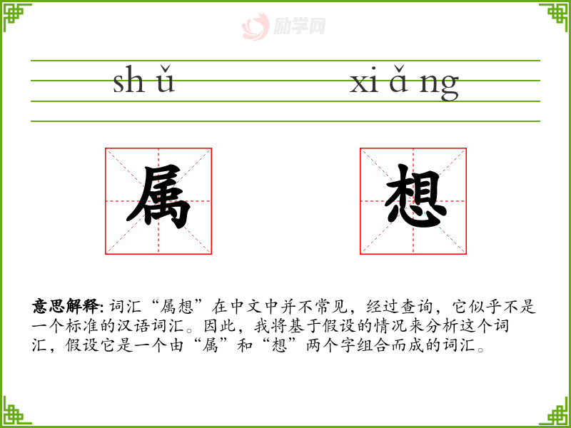 词汇“属想”在中文中并不常见,经过查询,它似乎不是一个标准的汉语词汇。因此,我将基于假设的情况来分析这个词汇,假设它是一个由“属”和“想”两个字组合而成的词汇。
