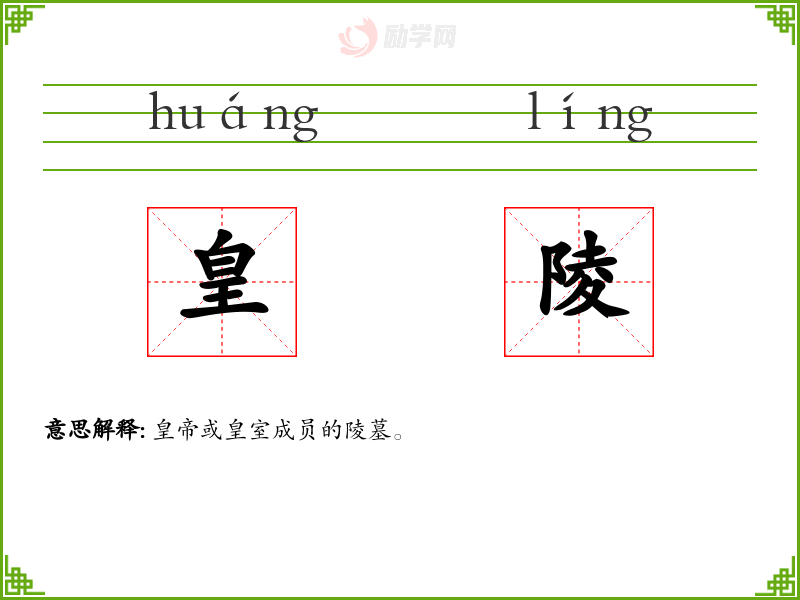 说文》-陵,大阜也。 《诗·小雅·天保》-如山如阜,如冈如陵。 《左传·僖公三十二年》-殽有二陵焉。 《国语·齐语》-陵阜陆墐。 《易·渐卦》-鸿渐于陵。 《聊斋志异·促织》-古陵蔚起。