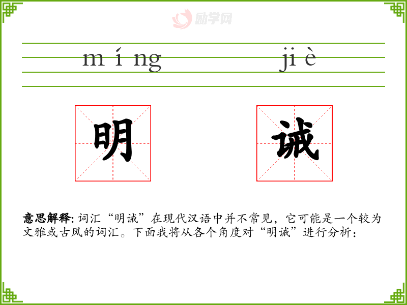 词汇“明诫”在现代汉语中并不常见,它可能是一个较为文雅或古风的词汇。下面我将从各个角度对“明诫”进行分析: