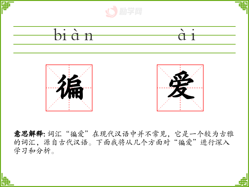 词汇“徧爱”在现代汉语中并不常见,它是一个较为古雅的词汇,源自古代汉语。下面我将从几个方面对“徧爱”进行深入学*和分析。