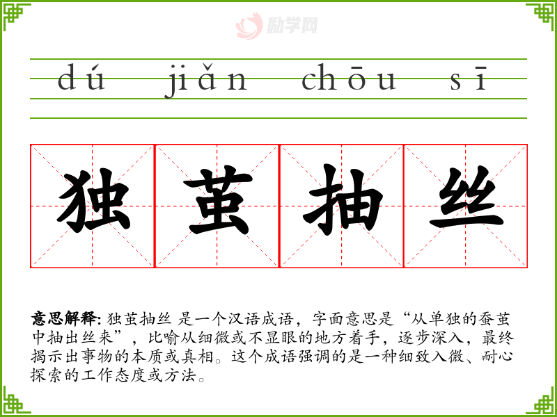 独茧抽丝 是一个汉语成语,字面意思是“从单独的蚕茧中抽出丝来”,比喻从细微或不显眼的地方着手,逐步深入,最终揭示出事物的本质或真相。这个成语强调的是一种细致入微、耐心探索的工作态度或方法。