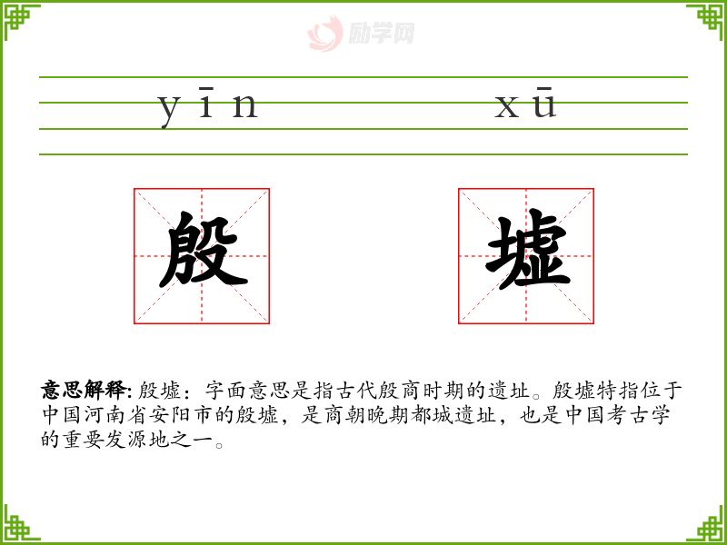 理解:殷墟不仅是一个考古遗址,更是中华文明的重要象征,承载着丰富的历史和文化信息。 重要性:在语言学*和表达中,了解和运用殷墟这样的词汇,有助于增强对历史和文化的理解和尊重。