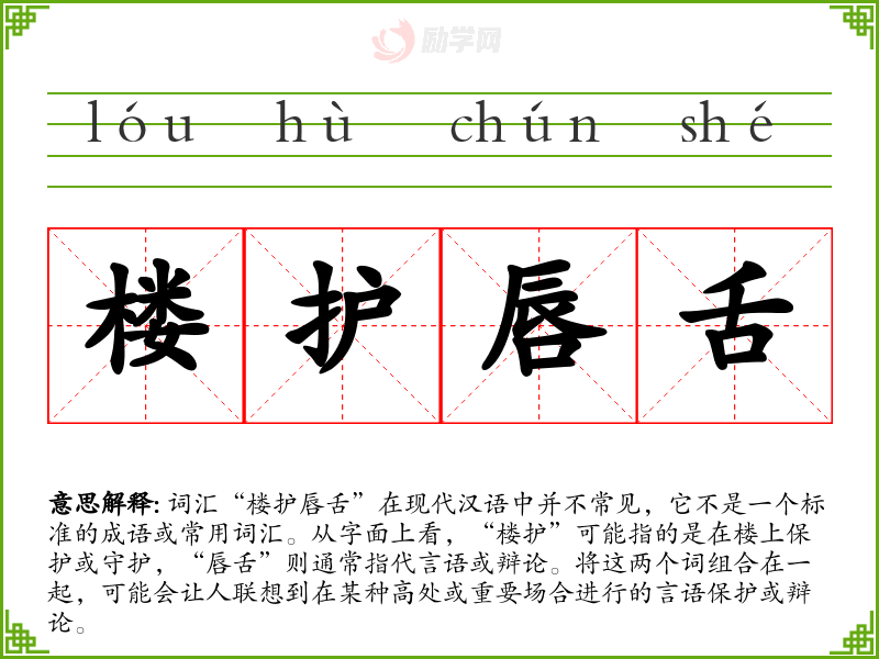 “楼护唇舌”虽然不是一个标准词汇,但从字面意思和可能的语境中,我们可以推测它可能指的是在重要场合或高处进行的言语保护或辩论。在语言学习和表达中,了解和掌握这样的词汇可以增加语言的丰富性和表达的多样性。