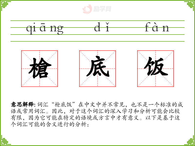 词汇“枪底饭”在中文中并不常见,也不是一个标准的成语或常用词汇。因此,对于这个词汇的深入学习和分析可能会比较有限,因为它可能在特定的语境或方言中才有意义。以下是基于这个词汇可能的含义进行的分析: