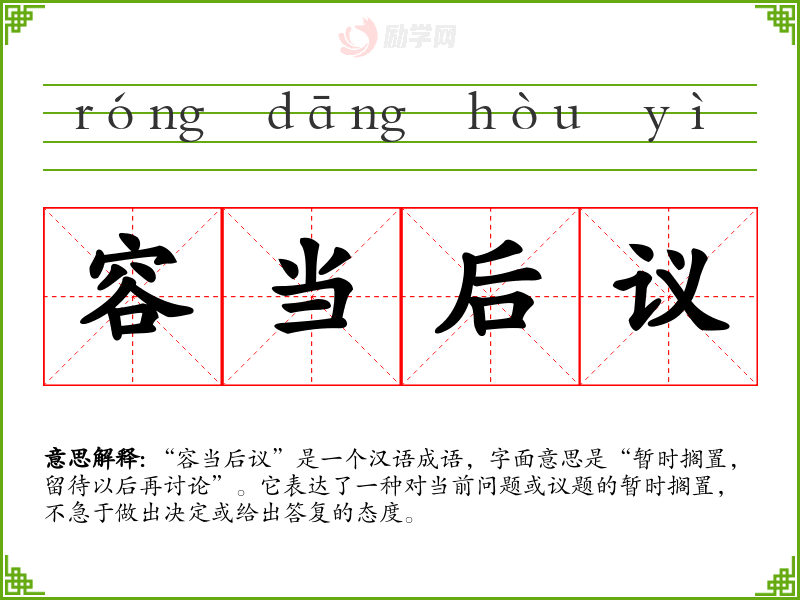 “容当后议”这个成语在汉语中是一个非常有用的表达方式,它不仅体现了对问题的慎重态度,也提供了在复杂情况下的一种应对策略。在学*语言和表达中,理解和正确使用这样的成语对于提升语言的丰富性和表达的准确性都是非常重要的。