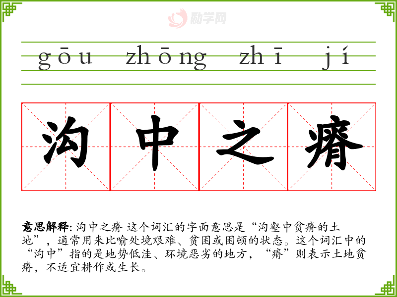 沟中之瘠 这个词汇的字面意思是“沟壑中贫瘠的土地”,通常用来比喻处境艰难、贫困或困顿的状态。这个词汇中的“沟中”指的是地势低洼、环境恶劣的地方,“瘠”则表示土地贫瘠,不适宜耕作或生长。