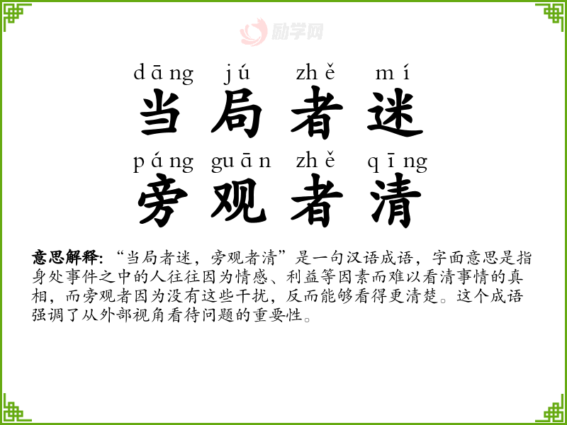 在日常生活中,我常常用这个成语来提醒自己在处理个人问题时要保持客观,不要被情绪所左右。例如,在和朋友讨论他们的感情问题时,我会用这个成语来建议他们从旁观者的角度去思考。