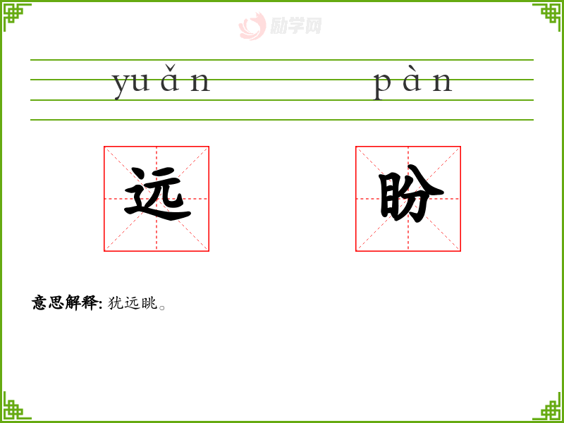 《说文》-远,辽也。 《尔雅》-远,遐也。 《礼记·王制》。注:“九州之外也。”-屏之远方。 《礼记·中庸》-柔远人也。 《礼记·乐记》-穷高极远。 《战国策·赵策》-念悲其远。 《左传·僖公三十三年》-远主备之,无乃不可乎? 《左传·三十三年》-劳师以袭远,非所闻也。 唐·杜牧《阿房宫赋》-缦立远视。 清·徐珂《清稗类钞·战事类》-火器利袭远,技击利巷战。 《广东军务记》-极目远望。