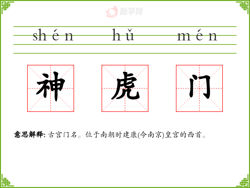 神虎门的意思是:古宫门名。位于南朝时建康(今南京)皇宫的西首。