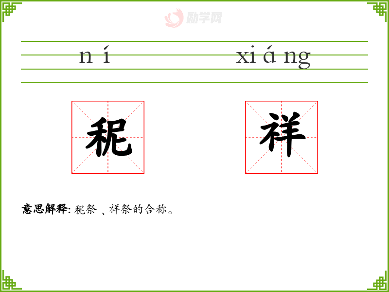 祥[ xiáng ] 1. (形声。从示,羊声。本义:凶吉的预兆,预先显露出来的迹象)。 2. 同本义。 【引证】 《周书·武顺》-无道曰祥。 《易·系辞》-吉事有祥。 《国语·周语》-辰马,农祥也。 《左传·昭公十八年》。注:“变异之气。”-将有大祥。 《三国演义》-卓问肃曰:“此何祥也?” 《左传·僖公十六年》-是何祥也,吉凶焉在? [更多解释]