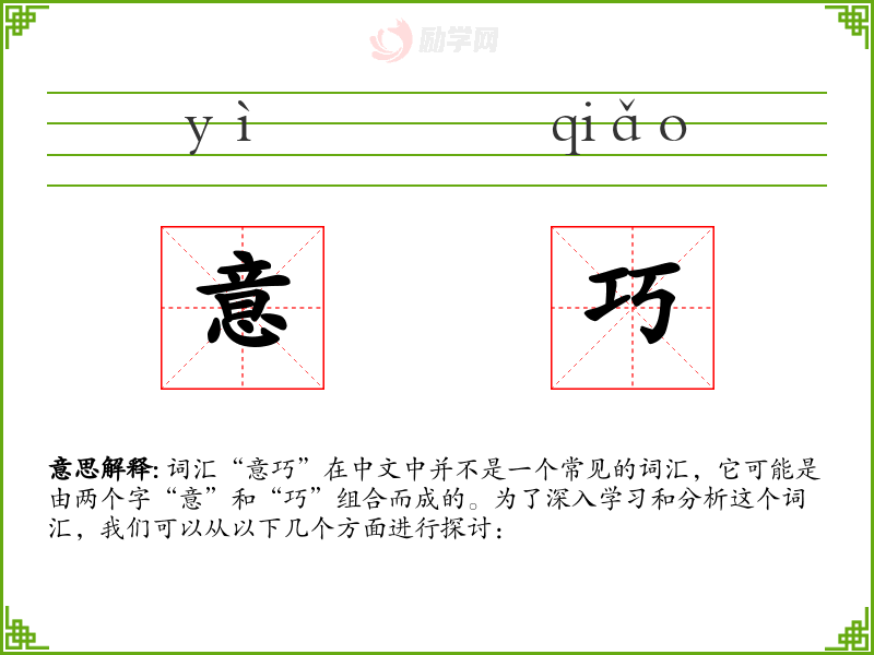 “意巧”这个词虽然不常见,但它体现了对智慧和技巧的赞美,对于语言学*和表达来说,了解这样的词汇可以丰富我们的表达方式,使我们的语言更加生动和精确。