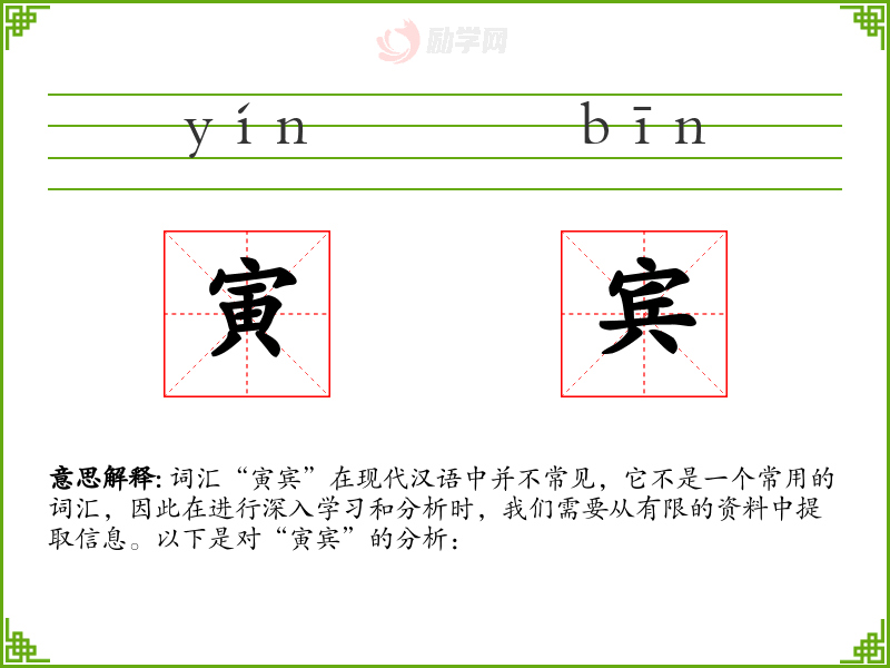 词汇“寅宾”在现代汉语中并不常见,它不是一个常用的词汇,因此在进行深入学*和分析时,我们需要从有限的资料中提取信息。以下是对“寅宾”的分析: