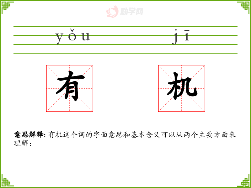 有机这个词的字面意思和基本含义可以从两个主要方面来理解: