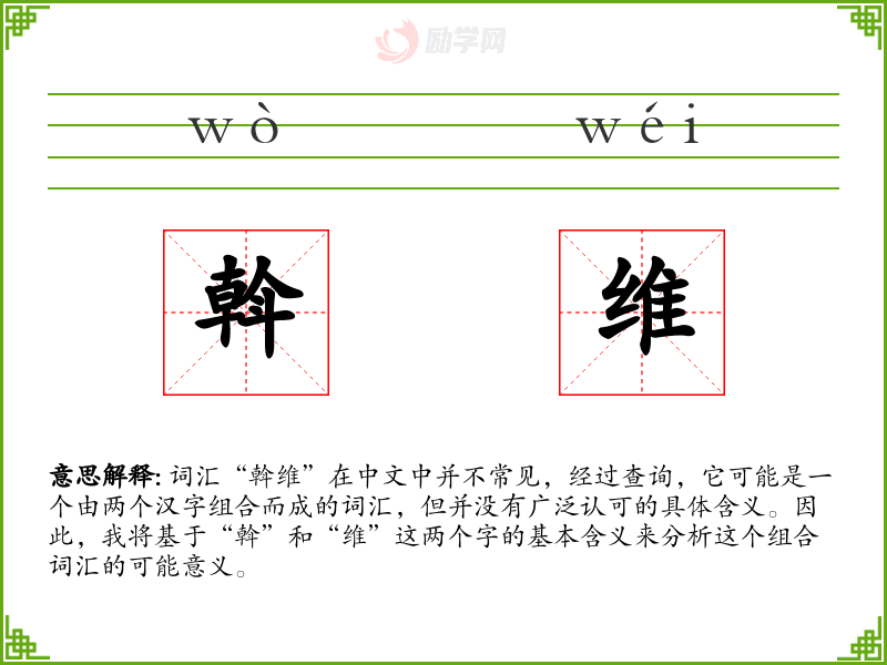 词汇“斡维”在中文中并不常见,经过查询,它可能是一个由两个汉字组合而成的词汇,但并没有广泛认可的具体含义。因此,我将基于“斡”和“维”这两个字的基本含义来分析这个组合词汇的可能意义。